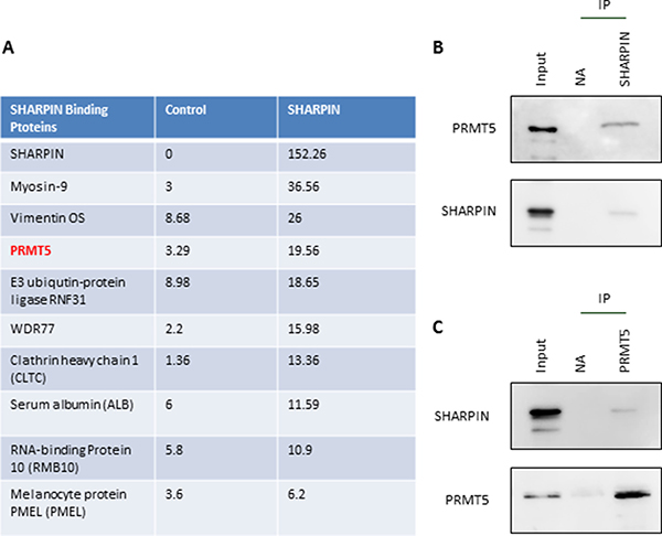Figure 2: PRMT5 is a new cofactor that interacts with SHARPIN. (A) LC-MS/MS was performed to identify proteins that interact with SHARPIN in A549 cells. Top 10 functional annotations interacted with SHARPIN were listed. (B) SHARPIN Immunoprecipitation (IP) was performed in A549 cell lysates with antibodies directed against SHARPIN or no antibody (NA) as a control. Immunoblots were performed for both PRMT5 and SHARPIN (positive control). (C) PRMT5 Immunoprecipitation (IP) was performed in A549 cell lysates with antibodies directed against SHARPIN or no antibody (NA) as a control. Immunoblots were performed for both SHARPIN and PRMT5 (positive control).