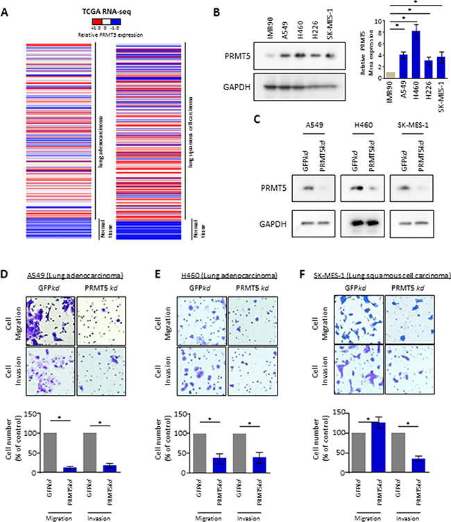 Figure 3: PRMT5 blocked lung cancer cell migration and invasion. (A) Heat map depicting gene expression of PRMT5 from RNA-Sequencing data with lung adenocarcinoma (LUAD, normal tissues vs tumor tissues) or squamous cell carcinoma (LUSC, normal tissues vs tumor tissues) in The Cancer Genome Atlas (TCGA). Expressions of PRMT5 are ranked by sample types. RNA-Seq values are shown by indicated bar. (B) PRMT5 expression profile in lung normal fibroblast cells and lung cancer cell lines. (Left panel) Whole cell lysate immunoblots for PRMT5 and GAPDH (loading control). (Right panel) qRT-PCR for relative mRNA levels of SHARPIN. β-Actin was used as an internal control. Values are means ± S.E.M. of three independent experiments. *p < 0.05 from one-way ANOVA test. (C) Confirmation of depletion of PRMT5 in lung cancer A549, H460 and SK-MES-1 cell lines. Immunoblots for PRMT5 and GAPDH as control, from indicated cells infected with shRNA targeted against negative control (NC) or against SHARPIN. (D–F) Cell migration and invasion assays for lung cancer cell line (D) A549, (E) H460 and (F) SK-MES-1 with depletion of GFP (ctr) or PRMT5. Representative crystal violet staining of invaded cells (upper panel) through a phase-contrast microscope (20X) is shown. Quantification of the invaded cells is shown (down panel). Values are mean ± S.E.M. of three independent experiments. *p < 0.05 from one-way ANOVA test.