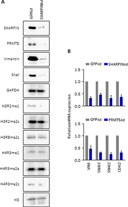 Remarkably, SHARPIN knockdown also altered Epithelial-MesenchymalTransition (EMT) protein markers exhibited by the loss of expression of Vimentin and Snail (Figure 4A), consistent with the loss of invasive phenotypes in the SHARPIN-depleted A549 cells (Figure 1D). Candidate metastasis-related genes (VIM, SNAI1, SNAI2 and CDH2) were identified from the literature [14, 15]. By performing qRT-PCR experiments on SHARPIN-depleted A549 cells, we confirmed that the expression of metastasis-related genes is regulated by SHARPIN and PRMT5. As shown in Figure 4B, these genes were significantly reduced in expression after knockdown of either SHARPIN or PRMT5.