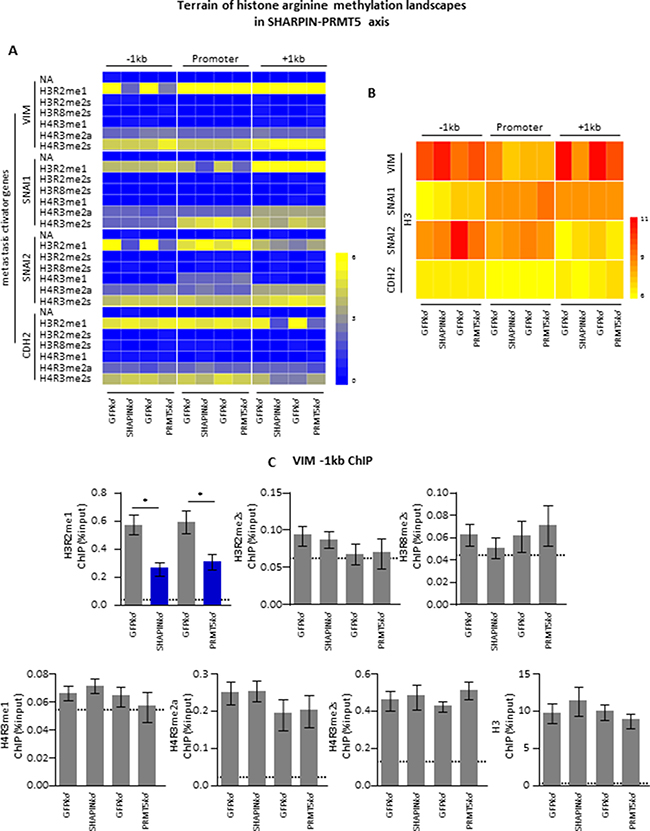 Figure 5: SHARPIN-PRMT5 controls a unique histone methylarginine code to regulate metastasis-related gene expression. (A) The values of ChIP-qPCR from PRMT5 and various histone methylarginines is used to generated a heatmap to demonstrate the characteristic distribution of histone methylarginines surrounding the candidate genes at -1kb, the promoter, or +1kb regions. The heatmap was arrayed from blue (no enrichment) to yellow (maximal enrichment) as shown by indicated bar. (B) Histone H3 is used as control for ChIP experiments (A). Heatmap generated by ChIP-qPCR values for histone H3 values at -1kb, the promoter, or +1kb of the metastasis activator genes. The results indicated the H3 was pulled down evenly. There was no significant H3 enrichment changes between different groups. p value is measured with one-way ANOVA test. (C) Illustration of ChIP-qPCR results for VIM (-1kb) indicated in (A and B). The horizontal dotted line indicated the upper limit of the 95% confidence interval of the signal from no-antibody (NA) control ChIPs. Values are mean ± S.E.M. of three independent experiments. *P < 0.05 from one-way ANOVA test.