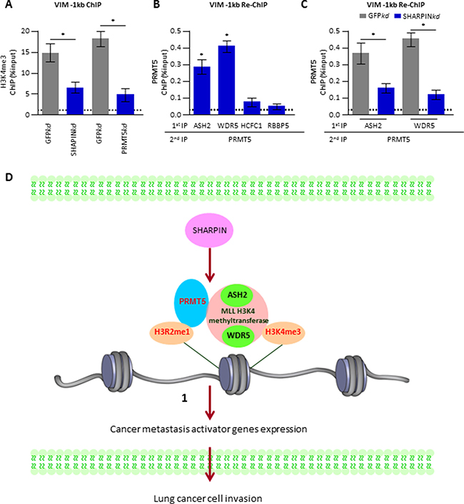 Figure 6: A novel SHARPIN-PRMT5-H3R2me1 axis is involved in regulating of metastasis-related gene expression. (A) H3K4me3 and H3 (control) ChIP-qPCR experiments of Vim (-1kb) in A549. The tested A549 cells expressed shRNA targeted against GFP as a control (GFPkd), against SHARPIN (SHARPINkd) or against PRMT5 (PRMT5kd). (B) Re-ChIP was performed in A549 cells with 1st round pull down of various MLL complex antibodies including ASH2, WDR5, HCFC1 or RBBP5 as well as 2nd round pull down of PRMT5 antibody. (C) A549 cells were depleted of GFP (ctr) or SHARPIN and harvested for Re-ChIP test. Re-ChIP was performed with 1st round pull down of ASH2 or WDR5 antibody as well as 2nd round pull down of PRMT5 antibody. (D) Model depicting SHARPIN affecting PRMT5 modulation of metastasis activator gene expression via H3Rme1 histone arginine methylation.