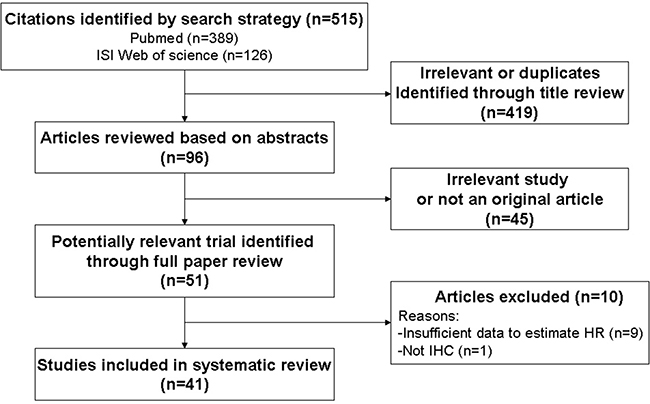 We got 515 publications using the literature screening strategy shown in Figure 1. After reviewing titles and abstracts, 464 irrelevant or duplicate studies were excluded. The remaining articles were identified through full paper review and excluded if GLUT-1 expression was not evaluated through IHC or if there were insufficient data to estimate HRs (Supplementary Table 3). Finally, 41 articles were included in the present study.