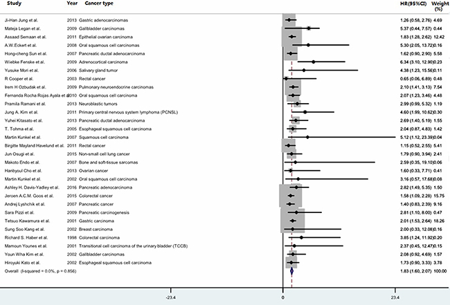 Twenty-one different types of carcinoma were investigated, most of which were carcinomas of the digestive system (five pancreatic adenocarcinoma, three esophageal squamous cell carcinoma, four each of oral squamous cell carcinoma and colorectal cancer, two each of gastric carcinoma). Other cancer types were also analyzed, including three studies each of ovarian carcinoma and non-small cell lung cancer (NSCLC), two studies on cervix carcinoma and gallbladder carcinomas, and the remaining 12 studies on different types of cancer.