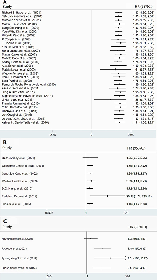 Chemoradiotherapy rather than surgery was given to patients in the study conducted by Jung A. Kim et al. (2011) [44]. Thus, we excluded this studies when reported a sensitivity analysis of OS, and our result was proven to be stable, but the exclusion of this report did not significantly alter the results (HR = 1.833, 95% CI: 1.597–2.069; P < 0.0001 and HR = 1.825, 95% CI: 1.588–2.061; P < 0.0001, respectively) (Supplementary Figure 2A). Similarly, the sensitivity analyses showed that the pooled HRs of DFS were reliable (Supplementary Figure 2B). In the sensitivity analysis of RFS, the report by Hiroyuki Mineta et al. (2002) affected the whole stability. We excluded this study and did meta-analysis again, the heterogeneity dropped from 59.1% to 0% (HR = 0.588, 95%CI: 0.281–0.895; P < 0.0001 and HR = 2.181, 95%CI: 0.929–3.434; P = 0.001, respectively) (Supplementary Figure 2C).