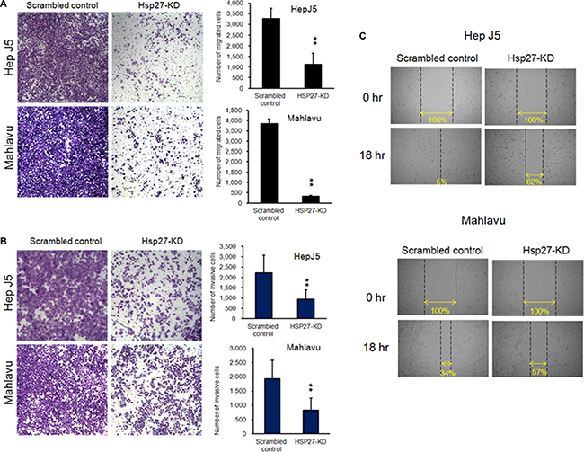 Figure 4: Silencing Hsp27 decreases HCC cell metastasis. HepJ5 and Mahlavu Hsp27KD cells exhibited lower migratory and invasive abilities (A), (B). HepJ5 and Mahlavu Hsp27KD cells also exhibited poor wound healing ability. (C) The wound-healing migration assay was performed using the ibidi system. The migratory abilities of scrambled control and Hsp27-KD cells were determined based on the area of the wound gap.