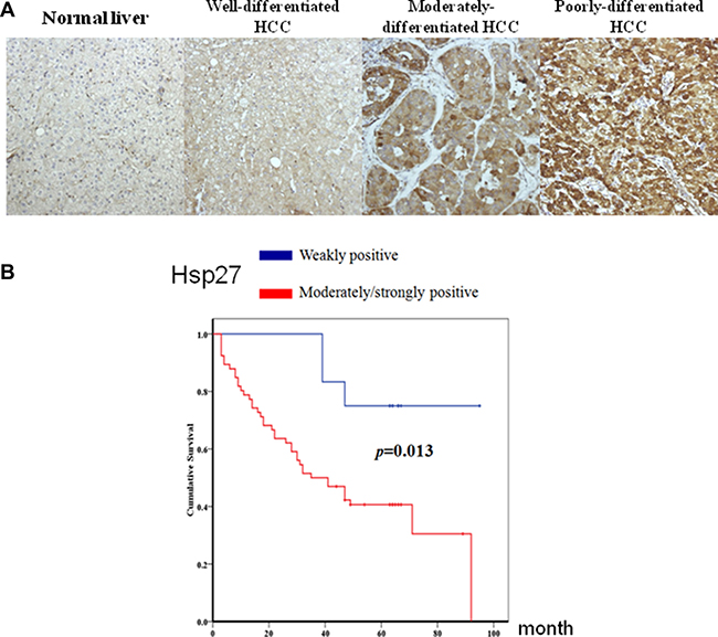 Figure 5: Associations between clinicopathological features and Hsp27 expression in hepatocellular carcinoma (HCC). (A) Hsp27 expression was stronger in HCC than in normal liver tissue. Poorly and moderately differentiated HCC expressed higher Hsp27 levels compared with well-differentiated HCC (p = 0.002). (B) Moderate/strong Hsp27 expression was associated with poorer prognosis in HCC patients (p = 0.013).