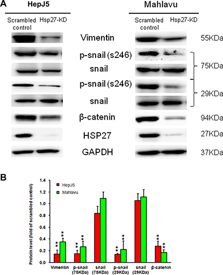 Figure 6: Hsp27 regulates EMT marker expression in HCC. The silencing of Hsp27 downregulated mesenchymal cell markers in HepJ5 and Mahlavu cells. GAPDH was used as an internal control. **p < 0.01.