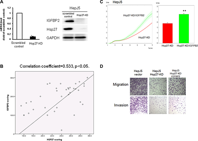 Figure 7: IGFBP2 is a downstream gene of Hsp27. The silencing of Hsp27 decreased the IGFBP2 (A) mRNA and protein levels in HepJ5 cells. (B) The expression correlation of Hsp27 and IGFBP2 was found in tissue array. The overexpression of IGFBP2 partially reversed the deficits in proliferation (C), migration and invasion (D) in Hsp27-KD HepJ5 cells.
