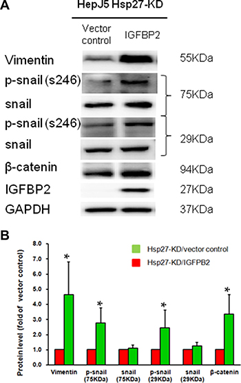 Figure 8: Overexpressing IGFBP2 in HepJ5 Hsp27KD reverses the EMT marker expression pattern. (A) The EMT expression levels were measured by western blot, and (B) quantitative results are shown.