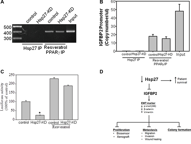To determine whether Hsp27 acts as a transcription factor that directly binds the IGFBP2 promoter, ChIP assays were performed in both scrambled control and Hsp27-KD cells. As a positive control, we used resveratrol to activate the PPARγ protein, which bind the IGFBP2 promoter. As shown in Figure 9A, ChIP assays showed that Hsp27 does not directly bind the IGFBP2 promoter in either scrambled control or Hsp27-KD cells, whereas resveratrol-mediated PPARγ activation was observed at the IGFBP2 promoter region. As shown in Figure 9B, real-time PCR (Q-PCR) assays also showed no gene amplification from eluents of the Hsp27 antibody from the IGFBP2 ChIP assay, whereas eluents from resveratrol-treated HCC cells treated with the PPARγ antibody contained approximately 20 copy numbers of the IGFBP2 fragment per microliter. To confirm that Hsp27 signaling mediates activation of IGFBP2 gene expression at the transcriptional level, we performed an IGFBP2 promoter luciferase assay using scrambled control and Hsp27-KD cells. An approximately 1.7-kb genomic fragment encompassing the human IGFBP2 gene (−1261 to +465) was inserted upstream of a luciferase reporter gene (pGL3 plasmid). Experiments utilizing the full-length construct demonstrated that IGFBP2 promoter activity was significantly reduced (> 4-fold) in Hsp27-KD cells (Figure 9C, **p < 0.05) compared with control HepJ5 cells. Additionally, both scrambled control and Hsp27-KD cells treated with 10 μM resveratrol for 24 h exhibited stronger luciferase activity than cells that were not treated with resveratrol, indicating that positive regulation by resveratrol mediates IGFBP2 expression.