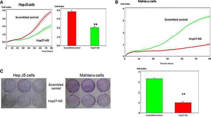 Figure 2: Hsp27 mediates the growth activity of HCC cells. The proliferation activity of scrambled control and Hsp27-KD HCC cells was determined by x-CELLigence biosensors in (A) HepJ5 and (B) Mahlavu cells. (C) Colony formation was assayed in scrambled control and Hsp27-KD HCC cells. All experiments were repeated at least three times independently. **indicates p < 0.01.