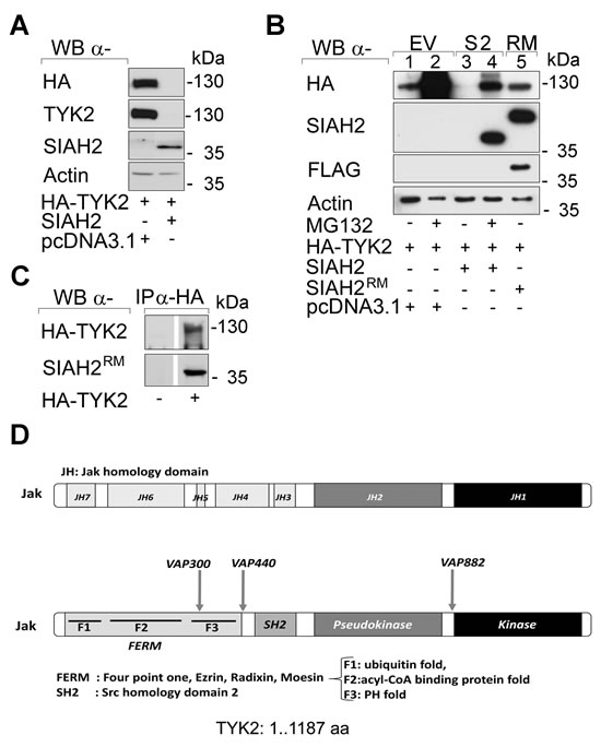 Fig 1: Catalytically intact SIAH2 reduces TYK2 protein levels. (A) HEK293T cells were transfected with vectors encoding HA-TYK2 (1 µg), wild-type SIAH2 (0.5 µg) or empty vector pcDNA3.1 (0.5 µg) instead of SIAH2. Cell lysates were analyzed by Western blot (WB; α, anti) as indicated; kDa corresponds to Mr according to protein ladder standards (Fermentas SM1811). (B) HEK293T cells were transfected with HA-TYK2, SIAH2, or mutant FLAG-RM-SIAH2H99A/C102A (SIAH2RM) [58]. Empty vector pcDNA3.1 was used to keep the amount of transfected DNA constant. After 24 h cells were treated with MG132 (+, 16 h, 2 µM) to preserve protein ubiquitinylation. Western blot analyses were done as indicated. (C) HEK293T cells were transfected with HA-TYK2 and mutant FLAG-RM-SIAH2H99A/C102A (SIAH2RM) [58]. Inactive SIAH2 had to be used due to the potent proteasomal elimination of TYK2 by wild-type SIAHs. HA-TYK2 was immunoprecipitated (IP) with α-HA antibody (-, IP from untransfected cells). Co-precipitated mutant SIAH2 and TYK2 were detected by immunoblot. (D) SIAH binding motifs (VxP) are contained within the TYK2 protein sequence.