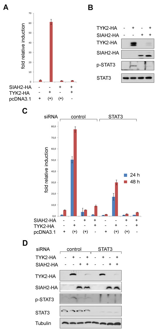 To answer this question we investigated whether the SIAH2-induced degradation of TYK2 affects transcriptional activation of a luciferase reporter system containing binding sites for STAT1/STAT3 homo- or heterodimers (GAS-Luc) in H1299 cells. Overexpression of TYK2 induced this reporter encoding luciferase and concomitant expression of SIAH2 strongly suppressed reporter activation (Fig. 3A). This interaction between TYK2 and SIAH2 could also be seen with a STAT1/STAT2-dependent ISRE-Luc reporter (Fig. S2).