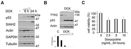 Fig 4: Induction of SIAH2 by p53 is linked to a decrease of endogenous TYK2. (A) H1299 cells were treated with doxycycline (DOX, 5 ng/ml; -, untreated cells) for 24 h. Induction of p53 and of SIAH2 were analyzed by Western blot. Actin, tubulin, and GAPDH serve as independent loading controls. (B) H1299 cells were treated with increasing amounts of doxycycline (DOX, 2.5/5/10/25 ng/ml; C, untreated cells) for 24 h. Induction of p53 and SIAH2 degradation of TYK2 were analyzed by Western blot (WB). Diagram below blots shows densities for [TYK2] divided by [Actin] (loading control). (C) MTT assay was used to evaluate the effect of doxycycline treatment on cytotoxicity in H1299 cells. Cells were stimulated as indicated and cell viability was measured as conversion of MTT by intact H1299 cells (untreated control cells were set as 100%).
