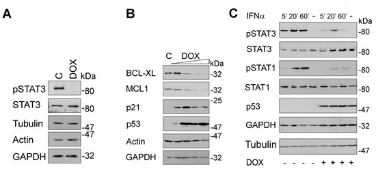 Fig 5: Induction of p53 blocks STAT signaling. (A) H1299 cells were incubated with doxycycline (DOX, 5 ng/ml; C, untreated cells) for 24 h. Phosphorylated and total STAT3 levels as well as three loading controls were assessed by immunoblot. (B) H1299 cells were treated as described in Figure 4B. Western blot analyses evaluated the levels of the STAT3 target genes BCL-XL and MCL1 as well as of p53 and its target gene p21; actin and GAPDH were used as independent loading controls. (C) H1299 cells were treated with DOX (+, 10 ng/ml, 24 h) or left untreated (-). Subsequently, cells were stimulated with IFNα (+, 103 U/ml; -, unstimulated) for the times indicated. Cell extracts were analyzed by immunoblot as indicated (kDa, Mr according to protein ladder standards: NEB P7708 or Fermentas SM1811).
