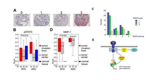 In summary, these data suggest that higher SIAH2 levels correspond to lower pSTAT3 and less MMP1 expression in human lung cancers. Fig. 6E summarizes key novel findings we present here.