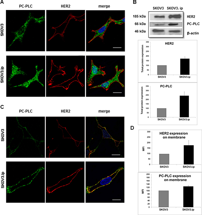 Sub-cellular localization of PC-PLC and HER2 in SKOV3.ip compared with SKOV3 cells