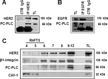 Figure 2: Molecular interaction of PC-PLC with HER2 in non-raft domains of SKOV3.ip cells. (A, B) Western blot analyses of anti-HER2 (A) and anti-EGFR (B) immunoprecipitates (IP), blotted with anti-PC-PLC, anti-HER2 and anti-EGFR pAbs, compared with the respective controls (CTR IgG anti-HER2 and anti-EGFR). (C) Sucrose gradient fractions isolated from cell lysates and analyzed by Western blotting for HER2 and PC-PLC detection. TL, total cell lysate. Caveolin 1 (CAV-1) and β1-integrin were used as markers for raft and non-raft domains, respectively.