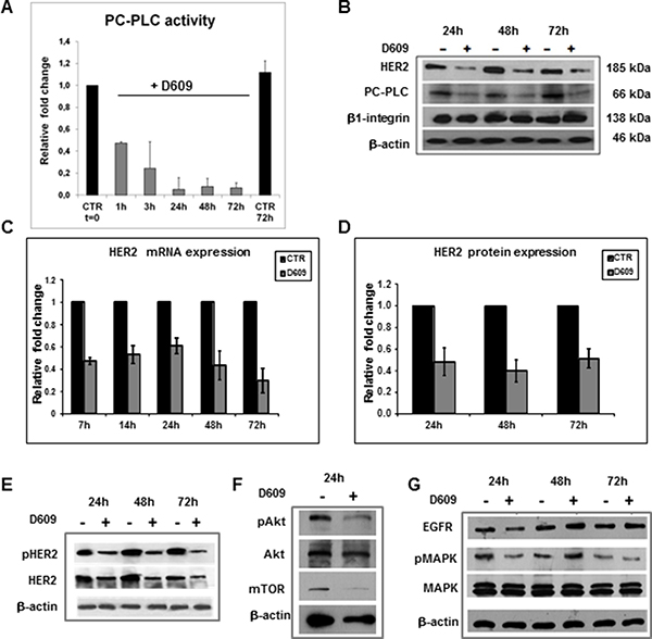 Western blot analyses of total lysates of cells exposed to D609 for 24–72 h (example in Figure 3B) showed substantially reduced protein expression levels for both HER2 and PC-PLC, while unaltered levels were detected for β1-integrin.