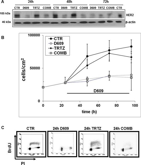 Figure 5: Differential effects of D609 and trastuzumab on HER2 protein expression, cell proliferation and cell cycle of SKOV3.ip cells. (A) Changes in the overall HER2 protein expression detected by anti-HER2 pAbs in Western blot experiments of total lysates of cells following exposure for different time intervals to D609 (50 μg/mL), trastuzumab (TRTZ, 10 μg/mL) or their combination (COMB). CTR, untreated control cells; example of three independent experiments. (B) Cell growth curves (mean values of cell counts ± STD, N = 3) of cells seeded at t = 0, cultured for 24 h and then treated for different times (24, 48 and 72 h) with either TRTZ, D609 or COMB, or left untreated (CTR). Statistical significance of differences: P(D609 versus CTR) = 0.030 at 24 h; 0.024 at 48 h; 0.010 at 72 h; P(TRTZ versus CTR) = 0.270 at 24 h; 0.690 at 48 h; 0.040 at 72 h. Differences between D609- and COMB-treated cells were not significant. (C) Flow cytometry analyses of cells performed under the same conditions as in panels (A) and (B) following 24 h of cell exposure to the different agents compared with the respective controls. Representative examples of dot plots showing DNA content (x-axis, propidium iodide (PI) fluorescence) and bromodeoxyuridine (BrdU) incorporation (y-axis, log FITC fluorescence) are reported.