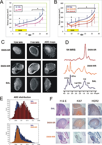 Table 1: Quantification of tumor specific growth rate (calculated after the first three doses of D609-treatment) and MRS/MRI parameters (measured between day 11 and 15 post-implantation, during treatment) in D609-SR, D609-WR and SALINE (SAL)-treated xenograft groups
