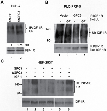 Figure 3: GPC3 decreases IGF-1R ubiquitination. (A) IGF-1R ubiquitination increased after GPC3 knockdown in HuH-7 cells. The cells were transfected with shGFP or shGPC3 and subsequently cultured in serum-free medium for 1 day. Immunoprecipitation was performed with anti-IGF-1Rβ, and western blot analysis was performed with anti-ubiquitin. Increased IGF-1R ubiquitination was observed in GPC3 knockdown cells (lane 2; p < 0.001, T test). Quantitation was also expressed as a fold-change relative to the control experiment. (B) IGF-1R ubiquitination decreased after GPC3 overexpression in PLC-PRF-5 cells. PLC-PRF-5 stable clones expressing either an empty vector or GPC3 were stimulated with IGF-1, immunoprecipitation was performed using anti-IGF-1Rβ, and western blot analysis was performed using anti-ubiquitin. IGF-1R ubiquitination levels were high in PLC-PRF-5 cells, but this increase was prevented through the overexpression of GPC3 (lane 3 and 4) with or without IGF-1 stimulation. (C) HEK293T cells were transfected with GPC3 or deleted GPC3 (ΔGPC3), together with ubiquitin, Grb10, and Nedd4. The cells were stimulated with IGF-1, and subsequently immunoprecipitation was performed using anti-IGF-1Rβ, and western blot analysis was performed using anti-ubiquitin. IGF-1 stimulation induced the ubiquitination of IGF-1R (lane 2), which was prevented by the overexpression of GPC3 (lane 4), but not ΔGPC3 (lane 6). The amount of IGF-1R was slightly decreased by ΔGPC3. All experiments were duplicated.