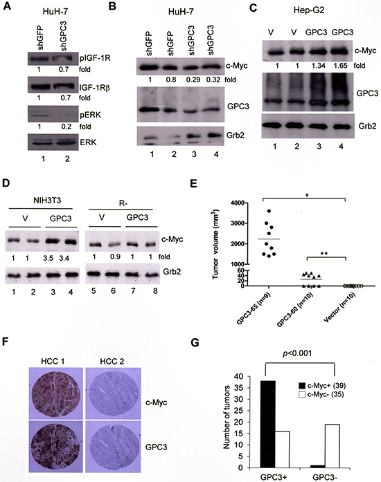 Figure 4: ERK phosphorylation and c-Myc expression are both dependent on GPC3. (A) HuH-7 cells were transiently transfected with shGFP or shGPC3. The cells were subjected to western blot analysis for phospho-IGF-1R, IGF-1R, phospho-ERK, and ERK. ERK phosphorylation was decreased by GPC3 knockdown (p < 0.005, T test). (B) HuH-7 cells were transiently transfected with shGFP or shGPC3. The cells were subjected to western blot analysis for c-Myc. The levels of c-Myc were reduced by GPC3 knockdown (p < 0.02, T test). (C) HepG2 cells were transfected with either GPC3 or an empty vector (V). Western blot analysis was performed for GPC3 and c-Myc. The levels of c-Myc were increased by the overexpression of GPC3 (p < 0.05, T test). The quantity of Grb2 was used as a control. (D) c-Myc expression was increased by GPC3 expression in NIH3T3 cells (p < 0.001, T test), but not in R- cells. Grb2 was used as a loading control. Quantitation after normalization was also expressed as a fold-change relative to the control experiment. (E) Dissected tumor volume isolated from GPC3-65 (n = 9) and GPC3-60 injected mice (n = 10). No tumor growth was observed in mice injected with vector control cells (n = 10) (*p < 0.001; **p < 0.005, T test). (F) Immunohistochemical staining of GPC3 and c-Myc in HCCs. HCC 1 showed the positive staining of GPC3 and c-Myc in tumor regions. HCC 2 showed the negative staining of either GPC3 or c-Myc. (G) Results of immunohistochemistry analysis of 74 HCC specimens for GPC3 and c-Myc. The expression of GPC3 and c-Myc was highly correlated (p < 0.001, Fisher’s exact test). All experiments were duplicated.