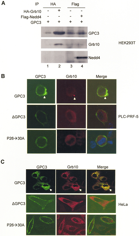 Figure 5: Grb10 binds to GPC3. (A) HEK293T cells were transfected with GPC3 together with HA-Grb10 or Flag-Nedd4. Immunoprecipitation performed with anti-HA or anti-Flag demonstrated that GPC3 was pulled down by Grb10 (lane 2), but not Nedd4 (lane 4). (B and C) Colocalization of GPC3 and Grb10. PLC-PRF-5 (B) and HeLa (C) cells were transfected with IGF-1R and Grb10, together with wild-type GPC3, ΔGPC3, or P26->30A and subsequently stimulated with IGF-1. Immunofluorescence staining was performed for GPC3 (green) and Grb10 (red). Wild type GPC3, but not ΔGPC3 or P26->30A was internalized and colocalized with Grb10 (arrow). All experiments were duplicated.