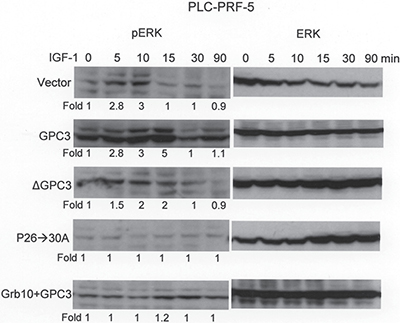 Figure 6: Grb10 blocks GPC3-enhanced IGF-1-induced ERK phosphorylation. PLC-PRF-5 cells were transfected with GPC3, ΔGPC3, P26->30A, or Grb10 + GPC3, and stable clones were selected. Western blot analysis for ERK and phosphor ERK (pERK) was performed at 0, 5, 10, 15, 30, and 90 min after IGF-1 treatment. In cells expressing empty vector (Vector), the phosphorylation of ERK occurred shortly after IGF-1 stimulation (p < 0.001 at 15 min, T test) but decreased 15 min later. GPC3 overexpression resulted in exaggerated and prolonged ERK phosphorylation. ΔGPC3 and GPC3 mutant P26->30A did not show exaggerated ERK phosphorylation. The overexpression of Grb10 blunted IGF-1-induced ERK phosphorylation and blocked the effects of GPC3 overexpression. All experiments were duplicated.