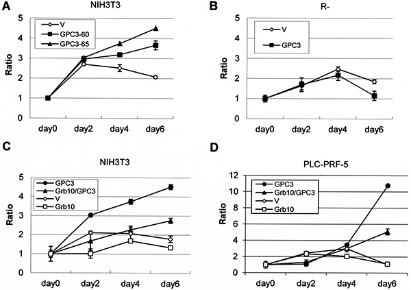 Figure 7: Grb10 decreases GPC3- and IGF-1R-dependent oncogenicity. The cells were transfected with expression vectors, and stable clones were grown in serum-free or low-serum medium for 6 days. Fold-cell number multiplication (Ratio) is depicted. (A) GPC3-expressing NIH3T3 clones grew better than empty vector (V)-expressing cells in serum-free medium. (p < 0.005 for GPC3-60 and p < 0.001 for GPC-65, T test). (B) GPC3-expressing R- cells grew poorer than the empty vector-expressing R- cells in 0.5% serum (p < 0.005, T test). (C) The overexpression of Grb10 decreased the growth rate of GPC3-expressing NIH3T3 cells in serum-free medium (p < 0.001, T test). (D) The overexpression of Grb10 decreased the growth rate of GPC3-expressing PLC-PRF-5 cells in serum-free medium (p < 0.005, T test). All experiments were duplicated.