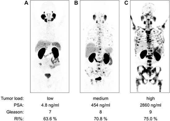Tumor load was analyzed visually to categorize the patients into three groups: low, medium and high tumor load. Patients with disseminated bone metastases (> 30 single lesions or diffusely confluent bone lesions encompassing more than half of the skeleton) showing intense uptake were defined as high tumor load. Patients with disseminated bone metastases showing only faint uptake or encompassing less than half of the skeleton, extensive PSMA-ligand accumulating lymph node bulks on both sides of the mediastinum or extensive PSMA-positive lung metastases were classified as medium tumor load. All other patients were classified as low tumor load.