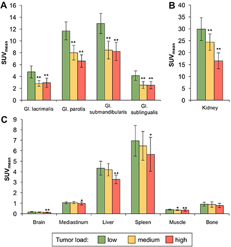 Figure 2: Reduction of Ga-68-PSMA-11 uptake in normal organs dependent on tumor load. Bars represent mean uptake of Ga-68-PSMA-11 (SUVmean), error bars represent ± ½ SD. (A) In the lacrimal and salivary glands, a highly significant reduction in tracer uptake was observed in the groups of patients with medium and high tumor load. (B) Also in the kidneys, tracer uptake was markedly decreased in patients with medium and high tumor load with high significance. (C) Regarding the remaining normal tissues evaluated, patients with high tumor load showed significantly reduced tracer uptake in the brain, mediastinal blood pool, liver, spleen and muscle, however the amount of uptake reduction was less pronounced compared to the lacrimal/salivary glands and the kidneys. No significant differences were observed for bone uptake. *marks significant differences to the low tumor load group (p < 0.05). **marks highly significant differences to the low tumor load group (p < 0.001).