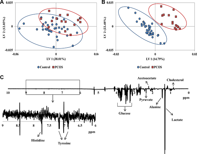 Especially focusing on the small molecules, CPMG (Carr-Purcell-Meiboom-Gill) 1H NMR spectra of follicular fluid provided a large number of identifiable peaks from metabolites. The 1H NMR CPMG spectra averaged over follicular fluid samples from each of the PCOS and control cohorts, together with the average difference spectrum, were shown in Supplementary Figure 1. PCOS patients and healthy controls exhibited marked differences in some metabolite signals, including alanine, lactic acid, cholesterol, and pyruvate. The dimensional reduction analysis – PLS was applied to the NMR spectra to facilitate visualization of group difference. The two population cohorts presented separated trend in PLS score plot shown in Figure 1A. The OSC-PLS further filtered out confounding physiological variations unrelated to the disease, such as diet, age, etc. Clearer separated clusters were observed in OSC-PLS score plot (Figure 1B) as it only exhibited class related biological changes. Suggested by OSC-PLS loadings that decrease of glucose, pyruvate, alanine, lactate, and increase of acetoacetate, cholesterol etc. contributed to the cluster separation along latent variable 1 (LV1, Figure 1C).
