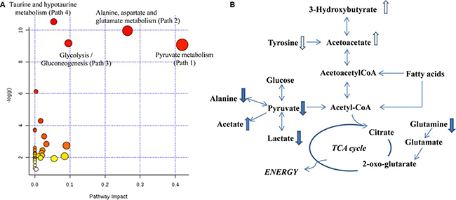Figure 2: (A) Overview of altered metabolisms suggested by MetPA; (B) Pathway diagram showing altered metabolites in PCOS follicular fluids. Upward (downward) arrows indicate slightly higher (lower) levels (p < 0.1) in PCOS. The solid filled upward (downward) arrows indicate significantly higher (lower) levels (p < 0.05) in PCOS.
