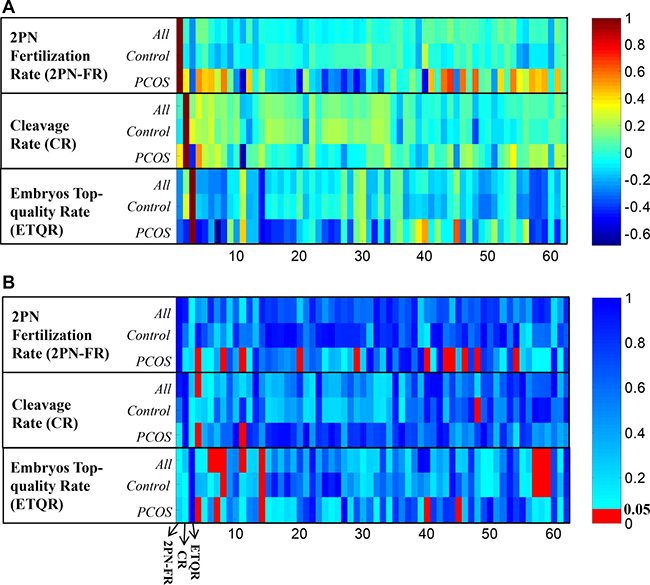 Figure 3: (A) Pearson correlation coefficients between ART clinical results (2PN fertilization rate, cleavage rate, and embryos top-quality rate) and NMR detected peak regions. The columns represent the 2PN fertilization rate, cleavage rate, top-quality embryos rate (x-axis 1~3), and PK1 to PK59 (x-axis 4~62) respectively; (B) Pearson correlation p-values of each paired data.