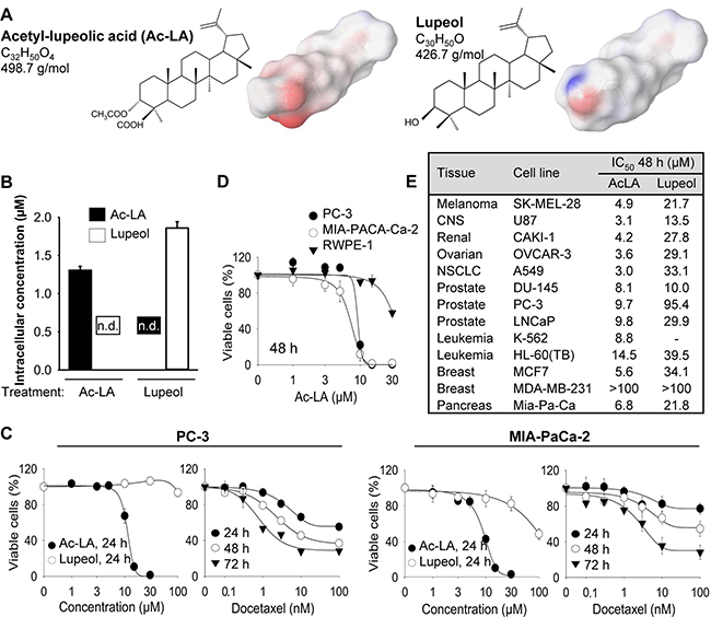 Figure 1: Ac-LA selectively inhibits viability of treatment-resistant cancer cell lines. (A) Chemical structures of ac-LA and lupeol and surface charge distribution. Atoms with negative partial charge are colored red, the atoms with positive partial charge are colored blue. (B) Ac-LA is not converted to lupeol in the prostate cancer cell line PC-3. Cells take up ac-LA and lupeol to a similar extent, no intracellular conversion of ac-LA into lupeol and vice versa could be detected within 6 h. Cells were treated with ac-LA and lupeol (10 μM each) and analyzed by reverse-phase HPLC. (C) In comparison to lupeol, ac-LA exhibits higher time- and concentration-dependent inhibition of viability of prostate and pancreatic cancer cells and in contrast to docetaxel does not induce resistance. Cells were treated for 24-72 h and viability was analyzed by XTT assay. (D) Nontumorigenic prostate epithelial RWPE-1 cells are relatively resistant to treatment with ac-LA. MIA-PaCa-2, PC-3, and RWPE-1 cells were treated for 48 h and cell viability was analyzed by XTT. (E) Ac-LA inhibits viability of a panel of cancer cell lines more potently than lupeol. Cells were treated and analyzed as in D. All results are mean ± SEM of three independent experiments each performed in triplicate.