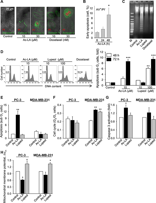 Figure 2: Ac-LA induces apoptosis in prostate cancer cells. (A) Ac-LA induced translocation of phosphatidylserine to the outer leaflet of the cell membrane. PC-3 cells were treated for 24 h, stained with annexin V-FITC (green) and PI (red), and analyzed by confocal fluorescence microscopy. (B) PC-3 cells were treated for different time periods with 10 μM ac-LA, stained as in A and analyzed by FACS. (C) Ac-LA induces DNA laddering in PC-3 cells treated for 48 h with 10 μM ac-LA; 100 μM lupeol and 10 nM docetaxel were used for comparison. (D) Ac-LA increases the apoptotic sub-G1 cell population. Left panel: typical histograms are shown (treatment for 72 h). (E) Ac-LA induces apoptosis in prostate PC-3 cancer cells more efficiently than in the breast cancer cell line MDA-MB-231. Cell were analyzed as in D after treatment with 10 μM of either ac-LA or lupeol for 72 h. (F) Cell-cycle analysis of cells treated with ac-LA or lupeol as in E. (G) Caspase 3 activation in PC-3 cells treated as in E for 6 h and analyzed using the caspase 3 substrate Z-DEVD-R110 followed by flow cytometry. (H) AcoA induces loss of mitochondrial membrane potential in PC-3 but not MDA-MB-231 cells. Cell were treated as in E for 6 h and the mitochondrial membrane potential, ΔΨm (red/green fluorescence intensity ratio), was analyzed using JC-1 dye staining followed by flow cytometry. All results are mean ± SEM, *p < 0.05, **p < 0.01, ***p < 0.001, n = 3.