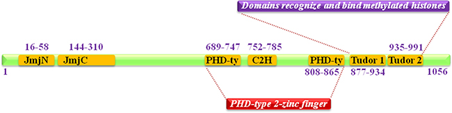 Figure 1: Schematic summary of JMJD2C domain structure. It contains one JmjN domain (N-terminal Jumonji N domain), one JmjC domain, two PHD (C-terminal plant homeodomain) and two Tudor domains that recognize and bind methylated histones.