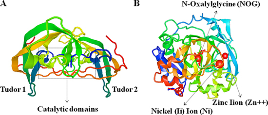 Figure 2: Crystal structure of human JMJD2C protein characterized by X-RAY diffraction. (A) The tudor domains that recognize and bind methylated histones, and the catalytic domains are marked in the schematic image of JMJD2C crystal structures. (B) The functional moleculars including NOG (N-Oxalylglycine), Zn (Zinc Iion) and Ni (Nickel (Ii) Ion) are presented in the precise image of JMJD2C crystal structures.