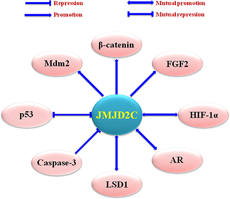 In colon cancer, Kim et al. firstly uncovered that JMJD2C was overexpressed in five colon cancer cell lines and especially associated closely with the growth of HCT-116 cells. Then they observed that transcriptional cofactor JMJD2C might form a complex with β-catenin, thereby regulating the levels of β-catenin downstream effectors, which was crucial for the advance of colon cancer. Furthermore, JMJD2C was required for efficient expression of cell cycle regulator Cyclin D1, oncogenic transcription factor FRA1 (Fos-related antigen 1), and anti-apoptotic BCL2 (B-cell lymphoma-2). These results strongly suggested that, JMJD2C might promote the survival of colon cancer cells via BCL2-dependent mechanism, and stimulate the proliferation of colon cancer cells via up-regulating the levels of Cyclin D1 and FRA1 [79]. In addition, Kim et al. also demonstrated that, down-regulation of JMJD2C led to the increased levels of tumor suppressor p53 [80].