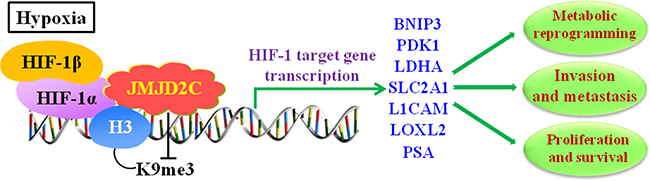 Figure 4: JMJD2C regulates the transcription of HIF-1 target gene in hypoxic environment, and involves in cancer progression including proliferation, invasion, metastasis, and metabolic reprogramming in tumors. In hypoxia, HIF-1α dimerizes with HIF-1β to form active HIF-1 complex. JMJD2C interacts with HIF-1α and promotes the transcriptional activation of HIF-1 targeting genes via demethylating di- and trimethylated H3K9. The HIF-1 targeting genes include BNIP3 (BCL2 Interacting Protein 3), PDK1 (Pyruvate Dehydrogenase Kinase 1), LDHA (Lactate Dehydrogenase A), SLC2A1 (Solute Carrier Family 2 Member 1), L1CAM (L1 Cell Adhesion Molecule), LOXL2 (Lysyl Oxidase Like 2), and PSA (prostate-specific antigen).