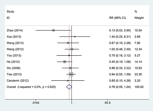 Eleven studies provided data on cardiovascular adverse events. The intracoronary Tirofiban reduced the risk of cardiovascular adverse events with low heterogeneity (I2 = 0.0%, P = 0.879, Figure 4). The relative risk and its 95% confidence interval was 0.47 (0.34–0.65). Nine studies reported the results of bleeding complications. The results from fixed-effect model indicated that there was no statistical significance between intravenous and intracoronary group (I2 = 0.0%, P = 0.625; RR = 0.76, 95% CI: 0.55–1.04, Figure 5).