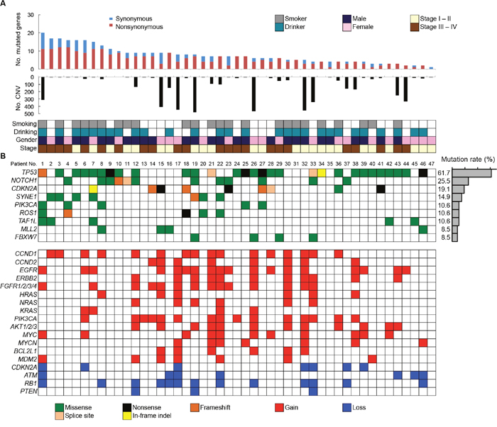 Figure 2: Summary of somatic mutations and CNVs across 47 OSCC samples. (A) The numbers of synonymous and nonsynonymous mutations (1st panel) and CNV regions (2nd panel) of each examined case are shown. In the bottom panel, the first row indicates smoking status, the second row indicates drinking status, the third row indicates gender, and the fourth row indicates cancer stage. Columns correspond to the examined cases. (B) Upper panels: Significantly mutated genes colored by the type of mutations and their mutational frequency. Lower panels: Significant CNVs detected in OSCC samples.