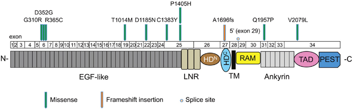 Figure 3: Mutation distribution in the exons and functional domains of NOTCH1. Each arrowhead represents a nonsynonymous mutation in an individual tumor. Individual exons are represented as numbered boxes. Conserved domains were mapped from UniProt. EGF-like, epidermal growth factor-like; LNR, Lin12/Notch repeats; HDN, heterodimerization–N terminal; HDC, heterodimerization–C terminal; TM, transmembrane; RAM, Rbp-associated molecule; Ankyrin, CDC10/ankyrin domain; TAD, transactivation domain; and PEST, a region rich in proline (P), glutamate (E), serine (S), and threonine (T).