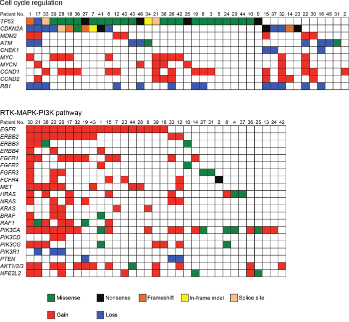 Figure 4: Genetic alterations identified by the sequencing of 409 cancer-related genes across 47 OSCCs impact cell cycle regulation and the RTK-MAPK-PI3K pathways. Each column denotes an individual tumor, and each row represents a gene. Somatic alterations are colored by the type of the event. A major proportion of patients with OSCC harbored alterations in one or more components in the pathways of cell cycle regulation (87.2%) and RTK-MAPK-PI3K signaling (70.2%).