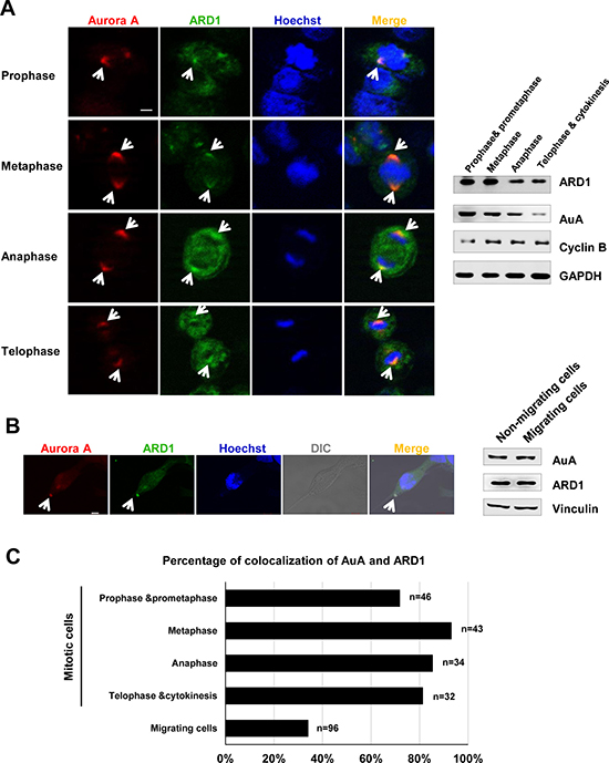 Figure 1: Aurora kinase A colocalalizes with ARD1 during cell division and cell migration. (A) Left, Aurora A colocalizes with ARD1 at centrosomes during cell division in prophase, metaphase, anaphase and telophase. GFP-ARD1 overexpressing cells (green) were synchronized and stained with anti-AuA antibody (red). DNA was counter-stained by Hoechst. Cells were then viewed under a confocal microscope. Scale bar, 5 μm. Colocalization of ARD1 and AuA is indicated by arrows. Right, Expression of ARD1 and AuA during cell cycle progression. Cyclin B1 was used as the markers of the cell cycle phases. GAPDH was used as loading control. (B) Left, Aurora A colocalizes with ARD1 in migrating cell. Monolayer of GFP-ARD1 overexpressing cells (green) on coverslip was scratched to stimulate migration, then cells were stained with anti-AuA antibody (red). DNA was counter-stained by Hoechst. Scale bar, 5 μm. Colocalization of ARD1 and AuA is indicated by arrows. Right, Expression of ARD1 and AuA during cell migration. Vinculin was used as loading control. (C) The percentage of cells exhibit the colocalization of ARD1 and AuA during the cell cycle progression and cell migration.