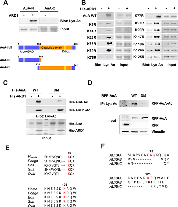 Lysine residues at positions 75 and 125 of AuA are acetylated by ARD1