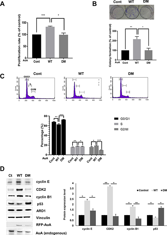 Figure 5: ARD1-mediated AuA acetylation enhances cell proliferation. (A) Acetylation of AuA increases cell proliferation. The overexpressing RFP-AuA WT and RFP-AuA K75R/K125R MCF7 cells were seeded in 96-well plates and cultured for 48 h. Cells were then treated with MTT and measured absorbance at 490nm. ***p < 0.0005; *p < 0.05. Error bar indicates S.E.M (n = 3). (B) Acetylation of AuA promotes colony formation of MCF7 cells. The overexpressing RFP-AuA WT and RFP-AuA K75/125 MCF7 cells were seeded in 6-well plates and cultured for 7 days. Cells were then fixed with formaldehyde and stained with crystal violet to visualize colony formation for quantification. Representative image is shown. **p < 0.005, *p < 0.05. Error bar indicates S.E.M (n = 3). (C) The overexpressing RFP-AuA WT cells shows the decreased population in G0/G1 phase and increased number of cells in S phase and G2/M phase. RFP-AuA WT and RFP-AuA K75R/K125R overexpressing MCF7 cells were stained with propidium iodide and analyzed by BD Calibur flowcytometry. ***p < 0.0005; **p < 0.005; *p < 0.05. Error bar indicates S.E.M (n = 3). (D) Acetylation of AuA increases expression level of cyclin B1, cyclin E and CDK2, whereas decreases expression level of p53. Expression level of target proteins were analyzed by western blot and quantified by Image J program. Vinculin was used as loading control. *p < 0.05; **p < 0.005. Error bar indicates S.E.M (n = 3).