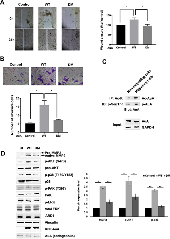 Besides its mitotic functions, AuA was reported to exert non-mitotic effects on cell movement and neurite elongation [36, 37]. The observation that AuA and ARD1 colocalized in migrating cells prompted us to explore the role of AuA acetylation in cell movement. A wound healing assay was implemented, in which a scratch was created in a monolayer of cells, and the closure rate was measured. Defect in AuA acetylation decelerated the wound closure remarkably, demonstrating that AuA acetylation is essential for cell migration (Figure 6A). Furthermore, a transwell invasion assay, wherein cells were seeded on matrigel and stimulated to invade into the lower chamber through the matrigel, was performed. The number of WT AuA-overexpressing cells that invaded the lower chamber was notably higher than that of mutant AuA-expressing cells (Figure 6B), suggesting that AuA acetylation regulated cell movement. Indeed, along with an increase in phosphorylated AuA, acetylated AuA levels were elevated significantly (Figure 6C). To clarify the molecular mechanism of cell migration regulation by K75/K125 acetylation, we analyzed AKT protein expression levels. Although AKT levels remained unchanged in both WT AuA- and K75R/K125R mutant AuA-overexpressing cells, phosphorylated AKT was augmented in WT AuA-overexpressing cells. AKT can be activated by several signaling pathways. We then tested expression level of p-38, p-ERK and p-FAK which are activators of AKT. In our study, AuA acetylation induced the phosphorylation of AKT via p38, but not via FAK or ERK signaling as phosphorylation level of p38 was elevated in WT AuA overexpressing cells, while the augmented phosphorylation of p38 was not observed in the mutant AuA overexpressing cells (Figure 6D). Because MMP-2 is downstream of AKT and crucial for cell migration and cell invasion, we measured MMP-2 expression levels. We noticed that MMP-2 expression was upregulated when cells exhibited ARD1-mediated AuA acetylation (Figure 6D), suggesting that K75/K125 acetylation regulates cell migration via the p38/AKT/MMP-2 axis.