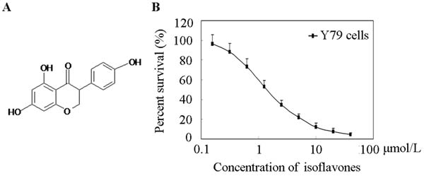 Figure 1: Effects of isoflavones on Y79 Cell proliferation. A. Chemical structure of isoflavones. B. Cell viability was determined with MTT assay. Cells were exposed to the indicated concentrations of isoflavones for 48 h. Each point represents the mean ± standard error of three independent experiments.